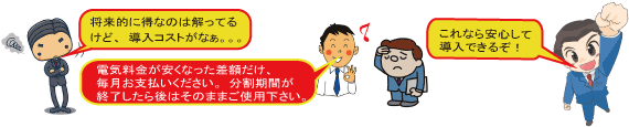 当プランは、そのような企業様のために、初期導入コストを最大ゼロ円とすることにより、まずはLED機器を導入して頂き、通常の電気料金から安くなった分だけを毎月の分割料金としてお支払い頂く(最長5年※公共施設は7年)ことで、導入に関して全く負担をかけず、そして数年後には安くなった電気料金の恩恵を全て受け取ることが出来るという非常にお得なプランとなっております。